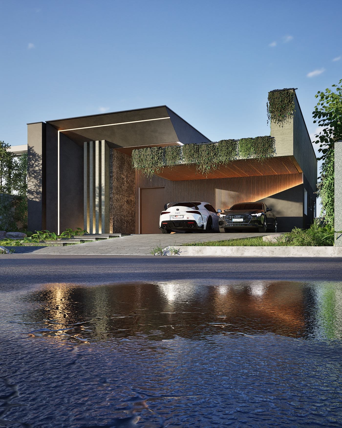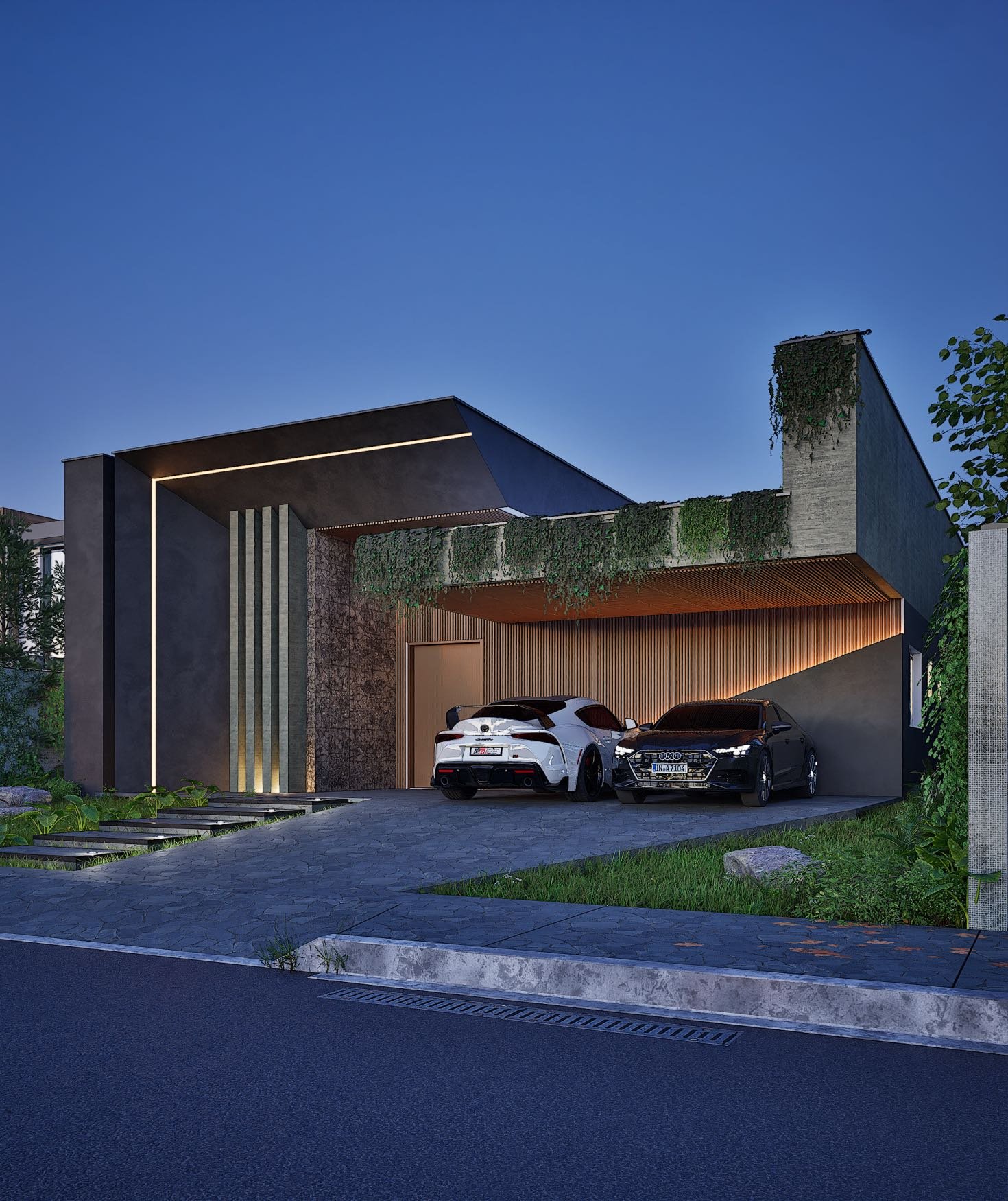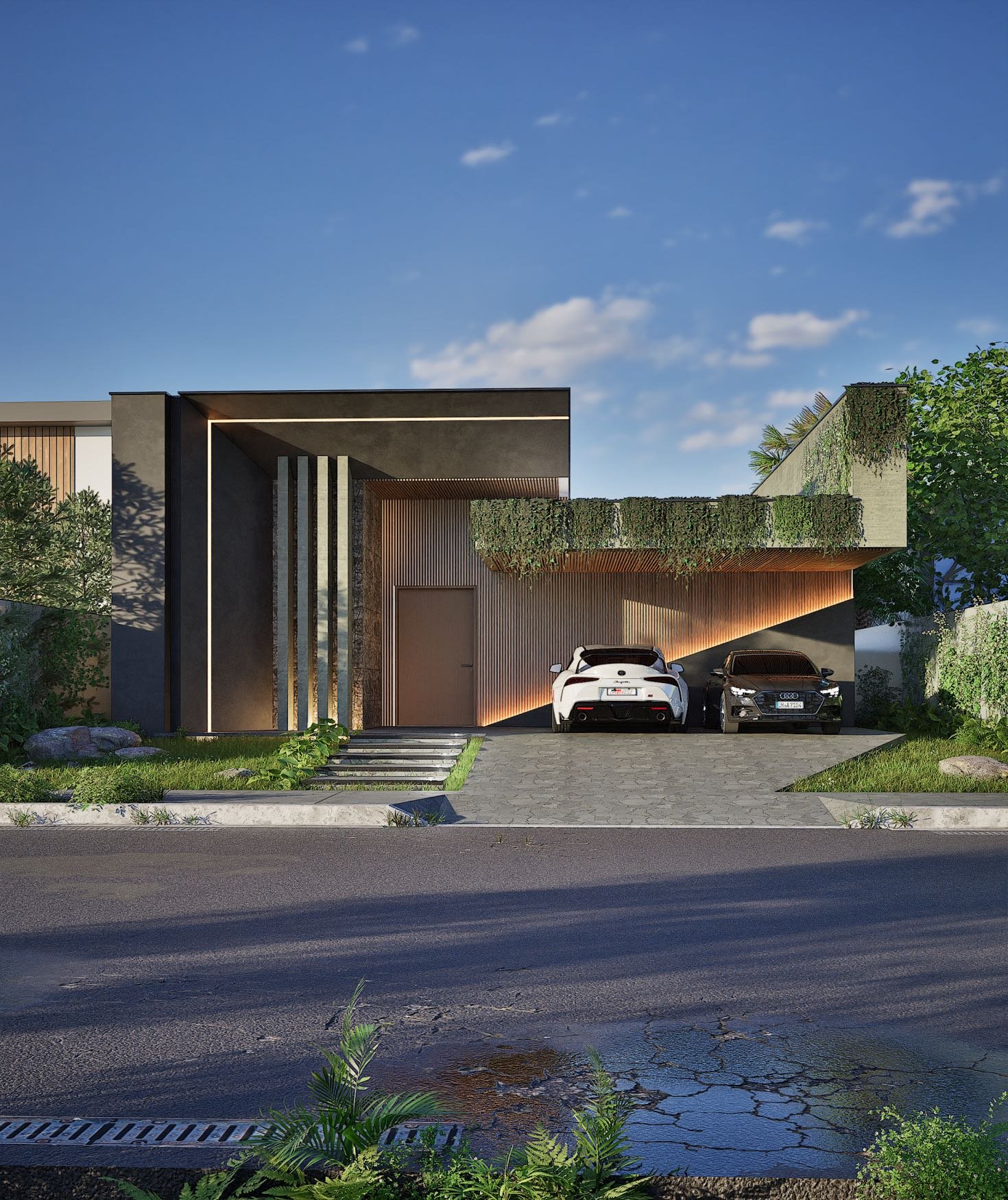 O destaque do projeto é o paisagismo exuberante, que combina espécies nativas e ornamentais para compor um cenário natural e acolhedor.